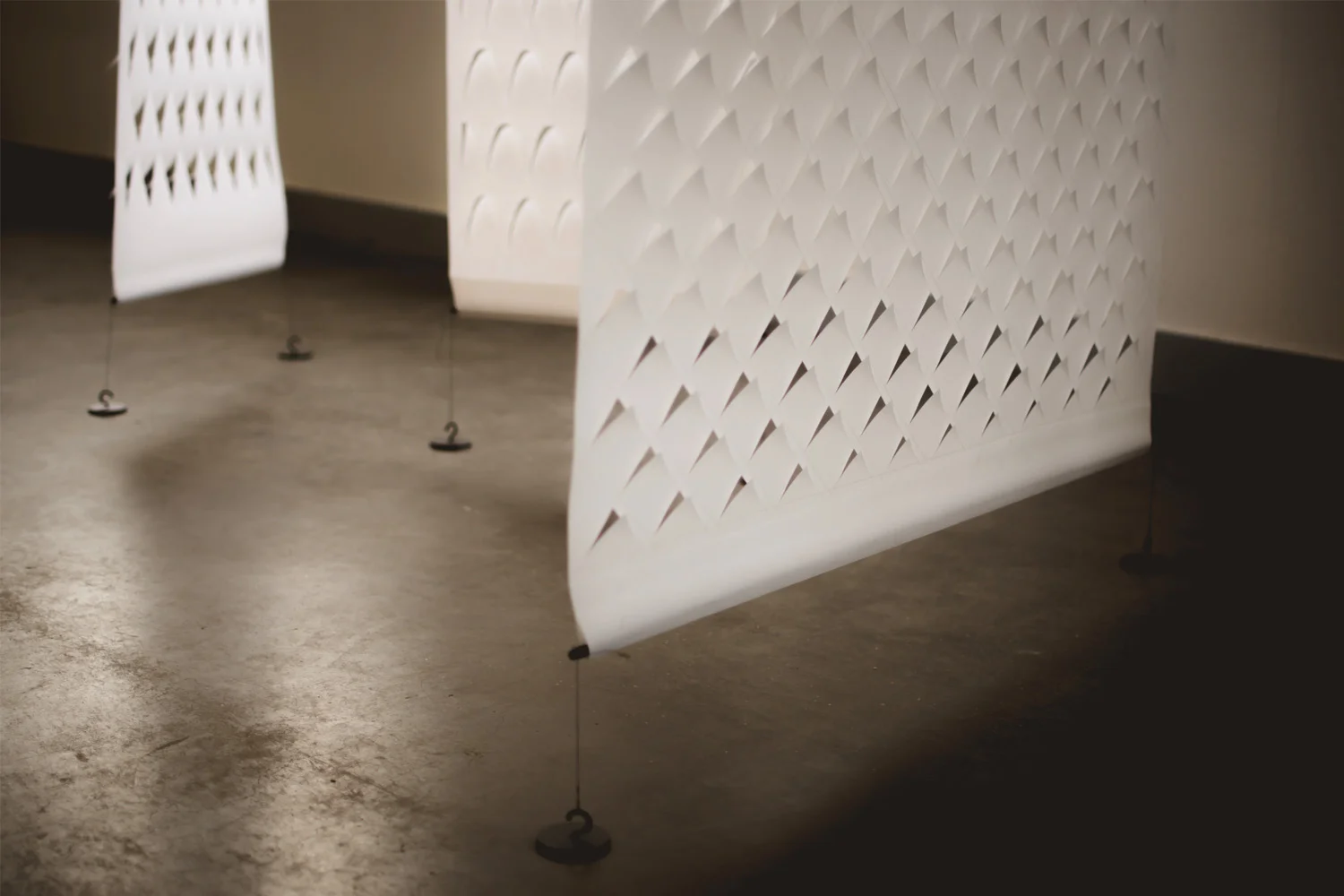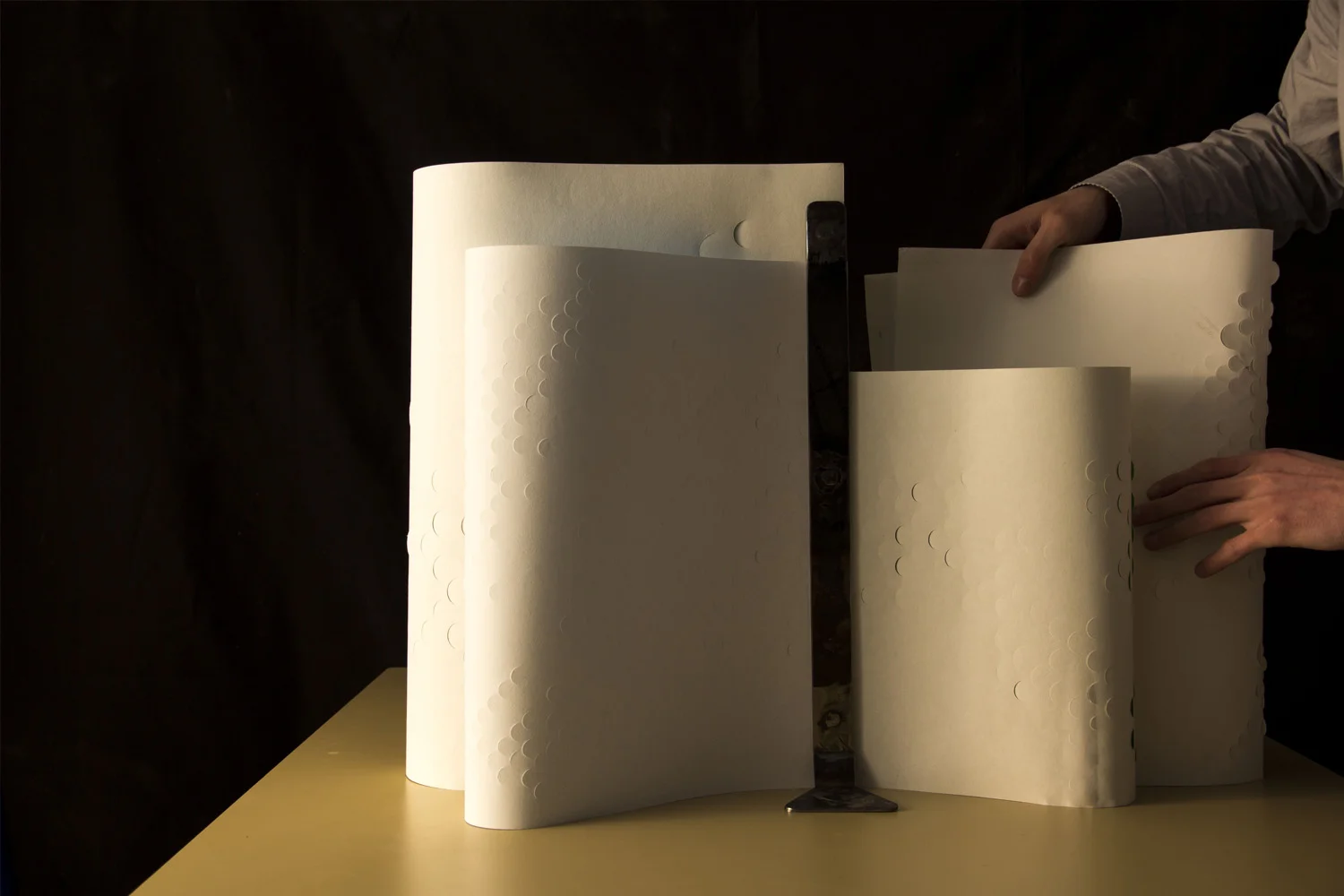 Procédés Chénel International met au service des créateurs un ensemble de techniques et matériels de décoration pour la réalisation d’expositions commerciales ou culturelles, de l’événementiel, du design et de l’architecture d’intérieure. Cette entreprise produit divers supports aux qualités particulières : calques, krafts, papiers non-tissés blancs ou teintés, bâches, toiles, papiers dorés, argentés ou alvéolés. À partir du papier blanc Drop Jet composé de cellulose, de polyester et de fibres de verre, il a été demandé aux étudiants de 1ère année de DSAA d’imaginer des parois, des luminaires et des installations destinées à l’habitat.